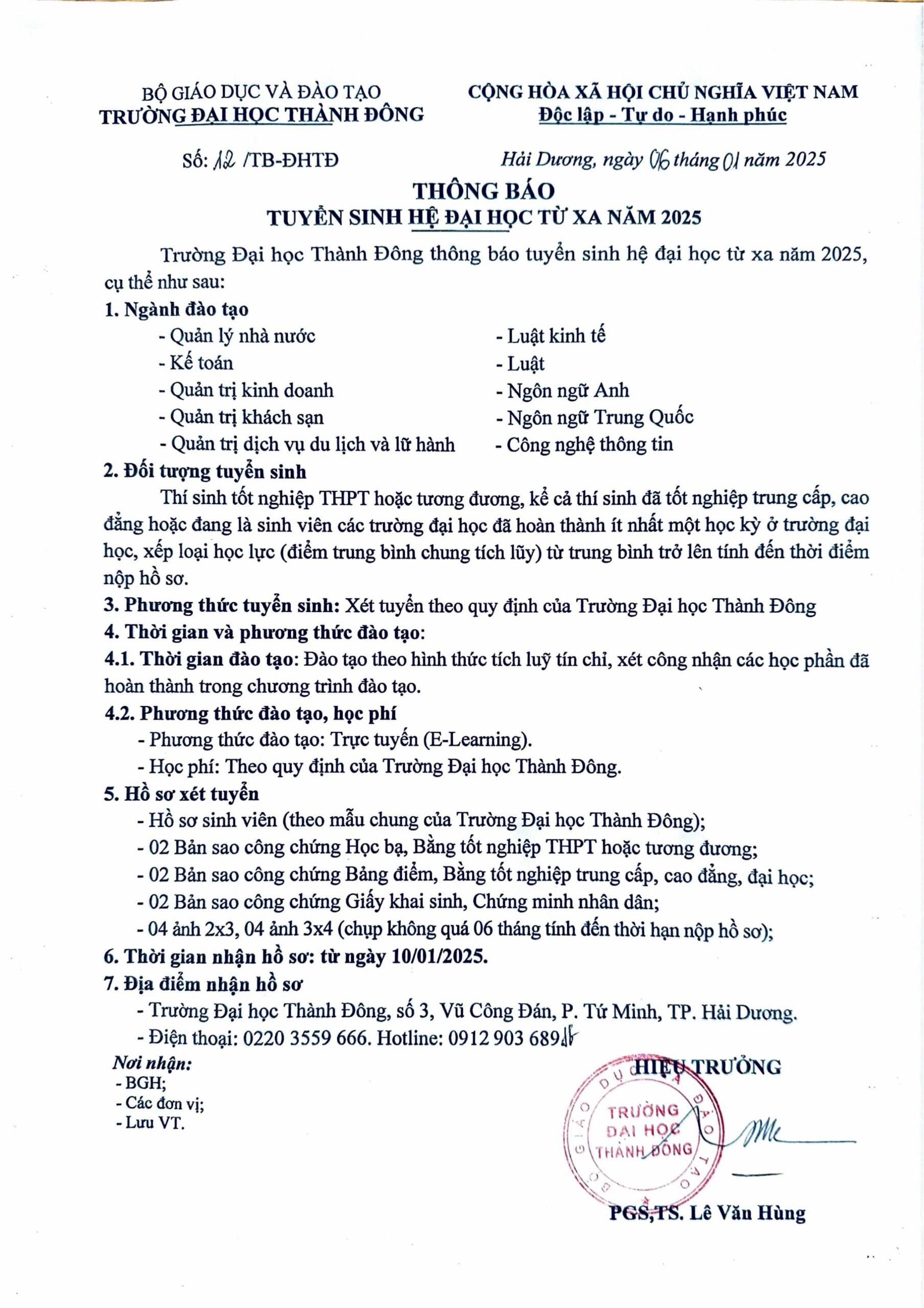 THÔNG BÁO TUYỂN SINH – HỆ ĐÀO TẠO TỪ XA NĂM 2025